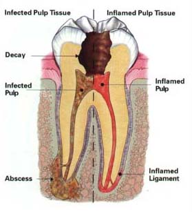 Endodontic treatment is necessary when the pulp becomes inflamed or infected. The most common reasons for inflammation or infection are deep cavities (caries), repeated dental procedures, cracks or chips. Trauma can also cause inflammation and often shows up as discoloration of the tooth. If pulp inflammation or infection is left untreated, it can cause pain or lead to an abscess.